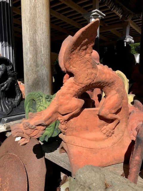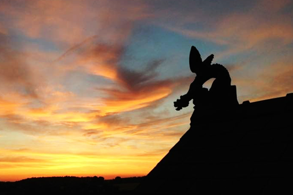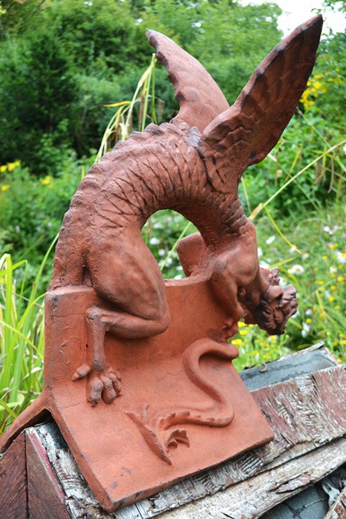 Dieser außergewöhnliche Drache erinnert an mittelalterliche Burghöfe. Seine ausgebreiteten Schwingen haben etwas dramatisch schönes und sein schlanker Körper wirkt elegant und schlangenartig. Er schlinkt sich um den Dachfirst und faucht seinen Feinden entgegen. Seine Figur ist sehr plastisch ausgearbeitet was ihm eine feurige Lebendigkeit verleiht. Drachen dienen als Schutz vor bösen Geistern und liefern ein eindrucksvolles Bild ab. Besonders bei Sonnenuntergang, wenn nur die schwarze Silouette dieses Fabelwesens zu sehen ist kann man sich seinem Bann kaum entziehen.