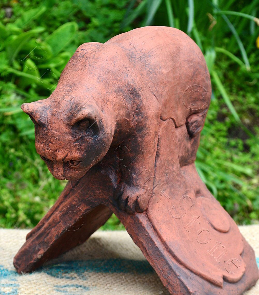 Diese hübsche Katze im Terracottalook sitz auf dem Dachfirst und schaut interessiert nach Unten. Dort hat sie etwas entdeckt was ihr Aufmerksamkeit erregt. halb zum Sprung angesetzt lauert sie so auf den richtigen Moment. Sie wirkt wie in der Bewegung eingefangen, was ihr ein besonders lebendiges Aussehen verleiht. Die nach vorne gerichteten Ohren und der intensive Blick lassen sie sehr realistisch erscheinen. Durch ihren Blick nach unten verbindet sie die beiden Ebenen miteinander. Die des Daches und die des Bodens. Dadurch schafft sie eine tolle Räumlichkeit, die uns die Höhe ihrer Platzierung bewusstwerden lässt.