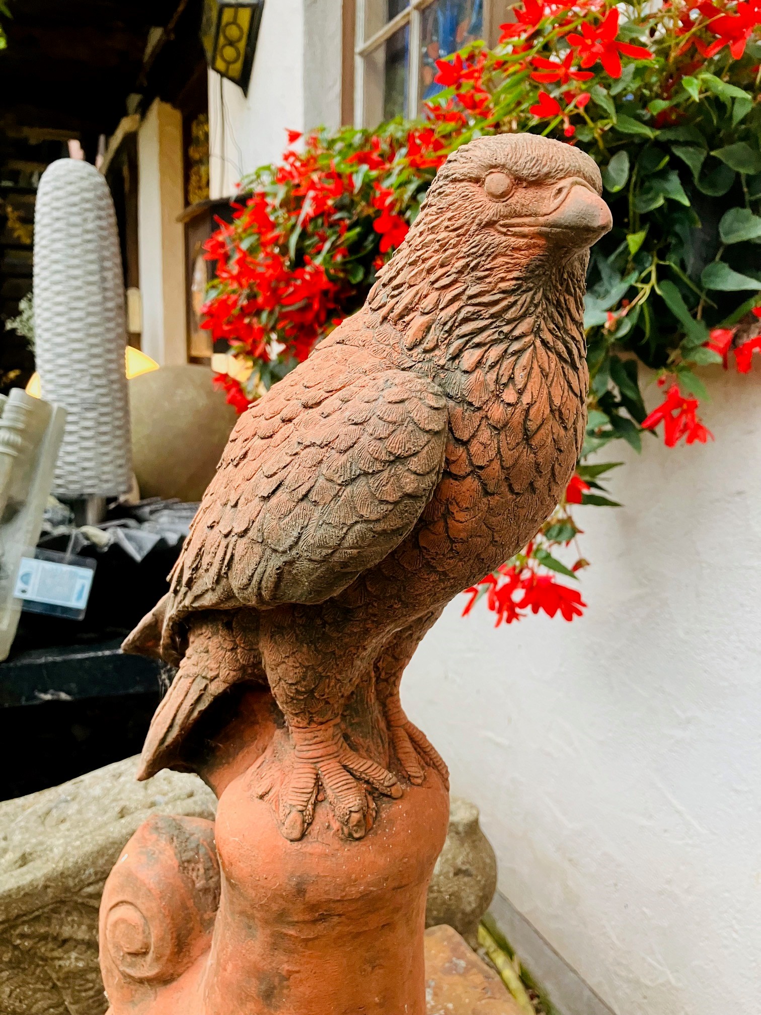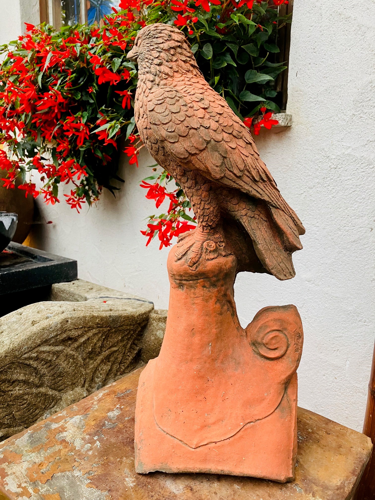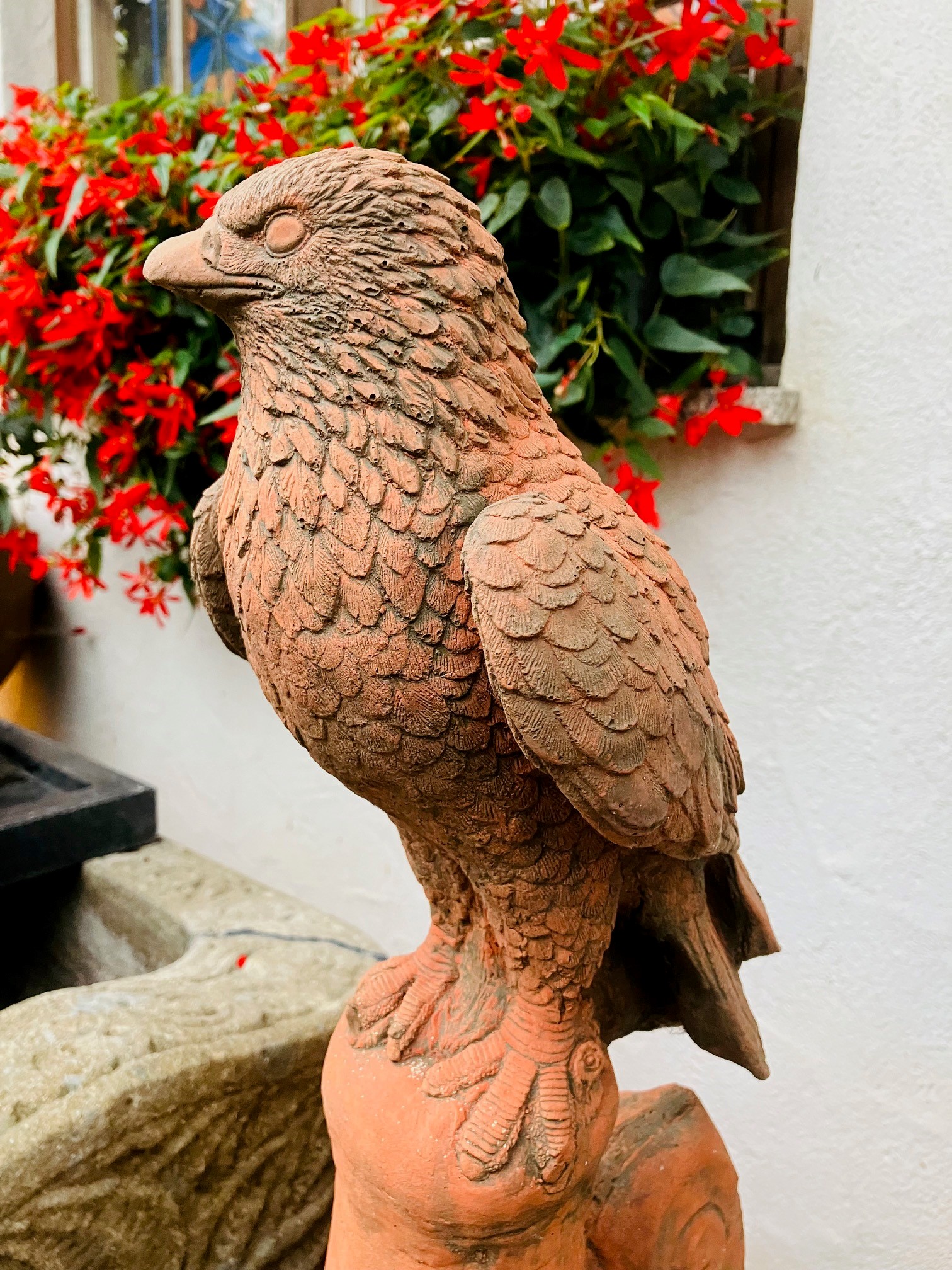 Dieser Falke besitzt ein fein ausgearbeitetes Federkleid, welches ihm ein lebendiges Aussehen verleiht. Er sitzt hoch oben auf dem Dachfirst in einer erhabenen und stolzen Haltung. Schon im alten Ägypten erkannte man die Einzigartigkeit dieses Vogels und verehrte ihn in Form des Lichtgottes Horus, welcher eine menschliche Gestalt mit einem Falkenkopf besaß. Auch das bekannte Horusauge ist an das Falkenauge angelehnt. Dieser Vogel steht aus heutiger Sicht vor allem für Scharfsicht, Schnelligkeit und Geduld. Bei der Jagt wartet er den richtigen Moment ab, um dann aus der Höhe herab zu stürzen. Dabei erreicht der Wanderfalke eine Geschwindigkeit zwischen 200 und 300 Stundenkilometern und wird damit zum schnellsten Tier der Erde.