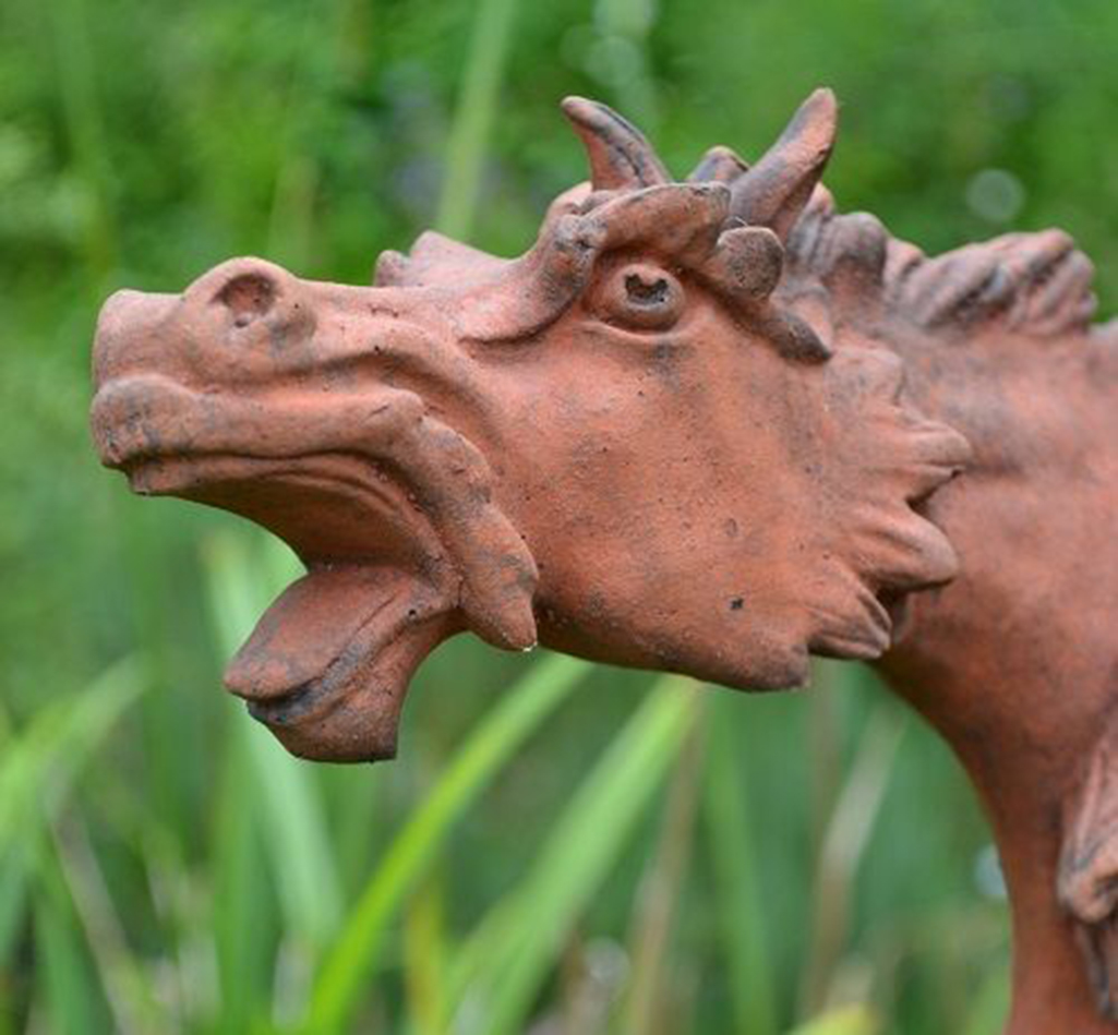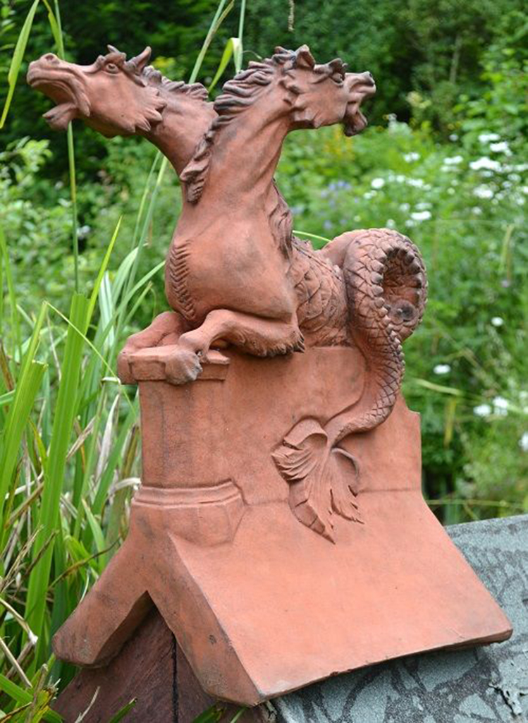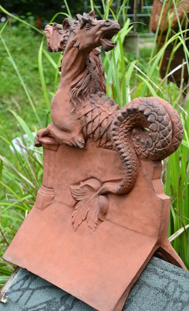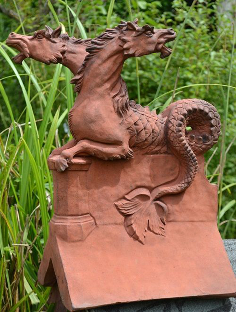 Dieses eindrucksvolle Fabelwesen wirkt wie eine Mischung aus Pferd, Drache und Schlange. Mit seinen zwei Köpfen und den weit aufgerissenen Mäulern strahlt es eine wilde Schönheit aus. Die Pferdeoberkörper münden in einen schlanken, schuppigen Schlangenschwanz welcher sich um den First schlinkt. Seine Haltung ist anmutig und verleiht seiner Wildheit etwas ästhtisches. Dieses Drachenwesen ist ein absoluter Hingucker und ein toller Dachreiter um böse Geister fernzuhalten.