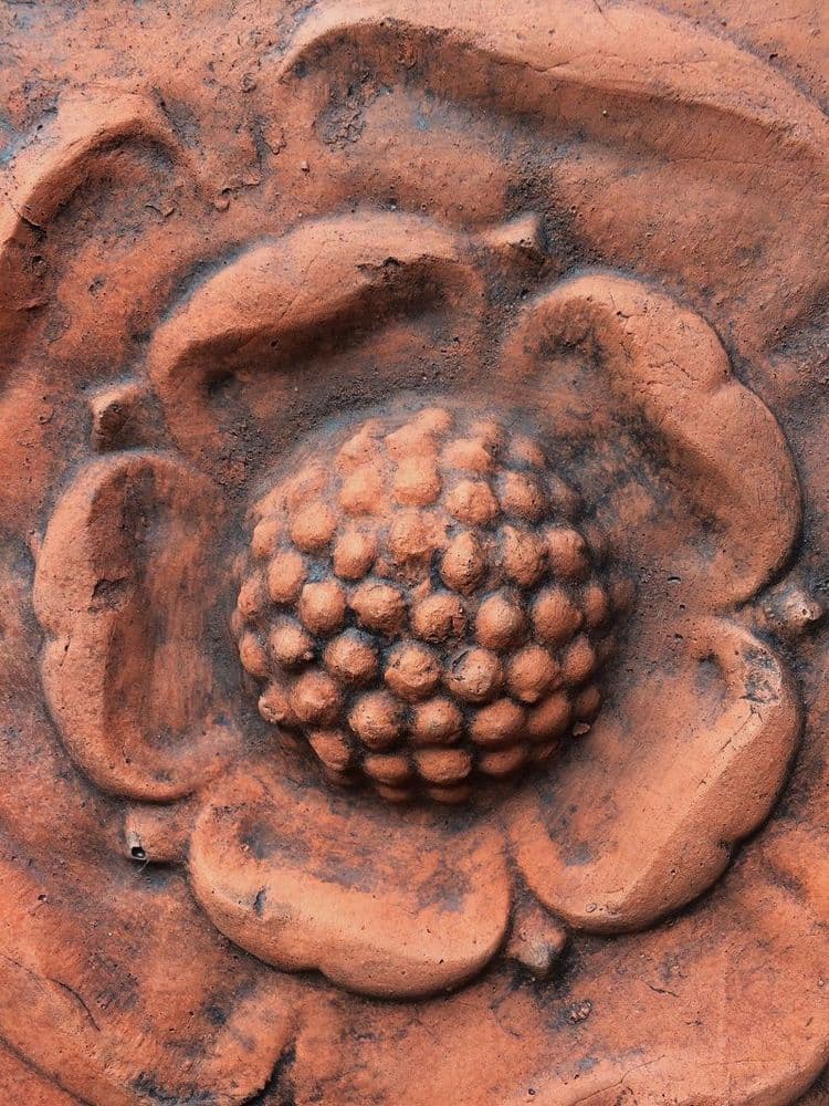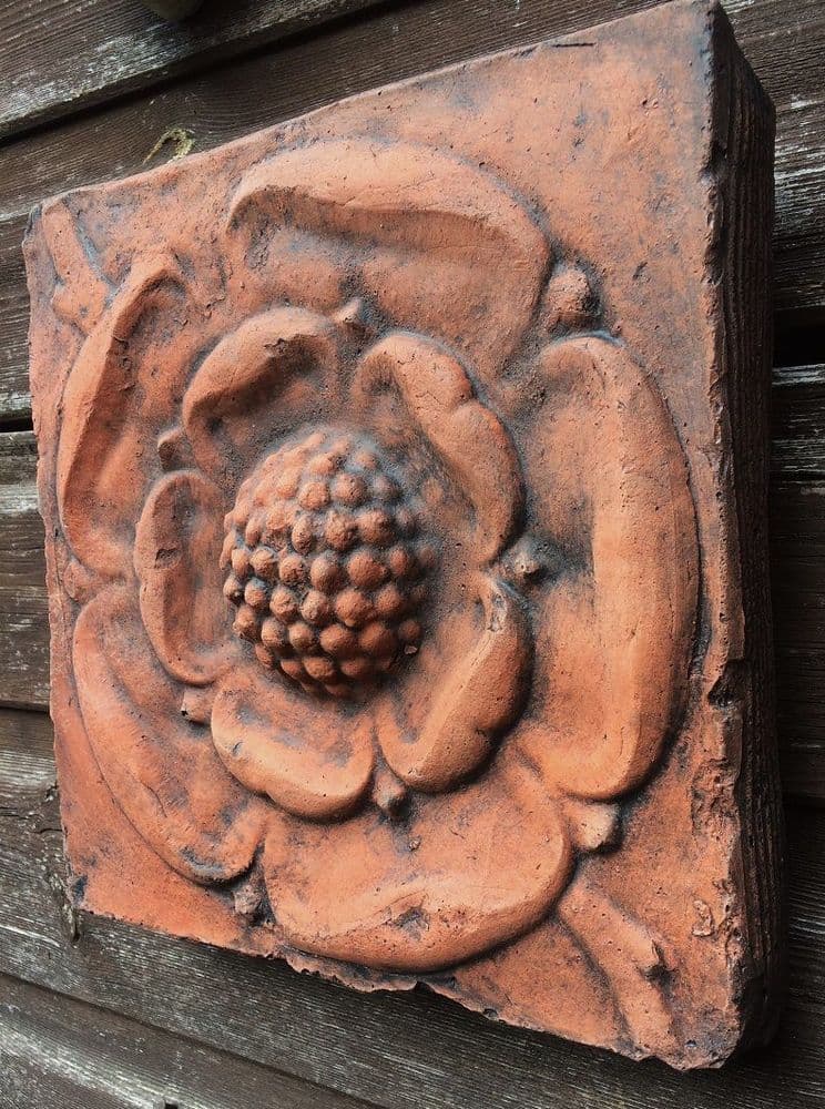 Diese Tudor Rose ist die Kopie einer antiken, dekorativen Ziegelfliese, die üblicherweise an historischen Gebäuden als architektonisches Detail zu finden ist. Das Stueck stammt aus den englichen Werkstätten in Sussex und wurde in Handarbeit aus Terracotta-Formstein gegossen.