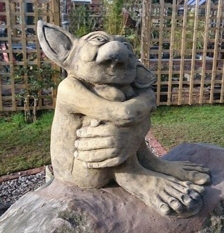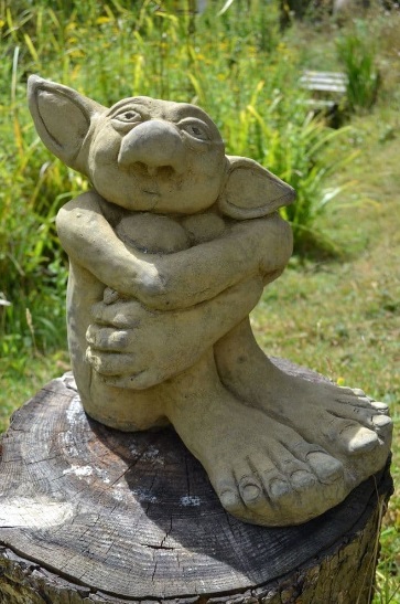 Der Wichtel sitzt gemütlich mit den Armen um die Beine geschlungen und beobachtet die Gegend.