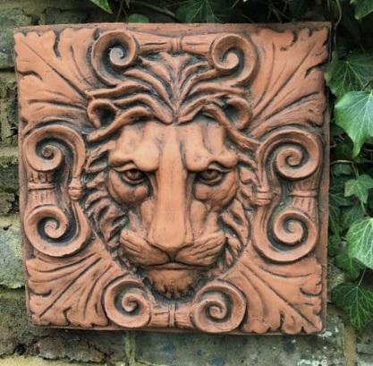 Diese wunderschöne Wandfliese hat die Darstellung eines 3 Dimensionalen Löwenkopfes. Das Stueck stammt aus den englichen Werkstätten in Sussex und wurde in Handarbeit aus Terracotta-Formstein gegossen.
