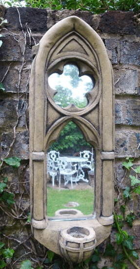 Der Stein-Spiegel im gotischen Stil ist aus hochwertigem Formstein und verleiht den Eindruck ein Original aus einer alten englischen Kirchenruine zu sein. Mit diesem Schmuckstück bringen Sie den Flair einer gotischen Kathedrale zu sich nach Hause, in den Wintergarten oder in den Garten.