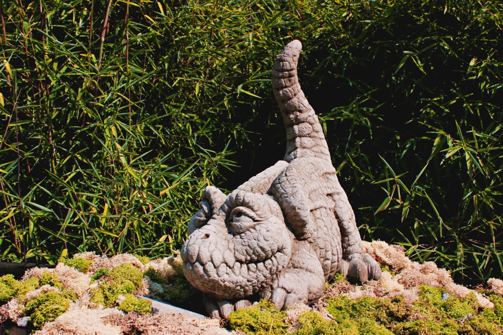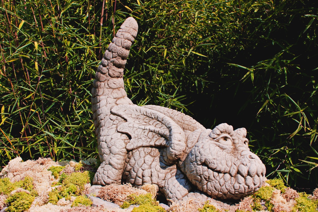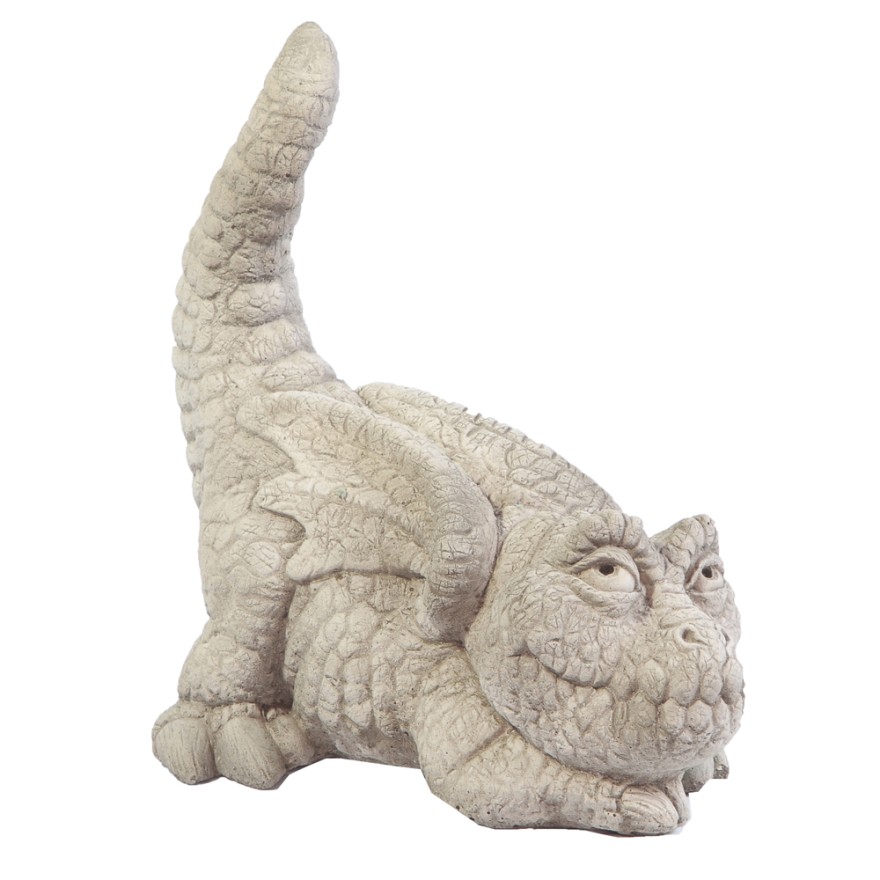 Mit seiner außergewöhnlichen, schuppigen Textur fällt dieser Drache sofort ins Auge. Sein Hinterteil ist erhoben, als würde er den Betrachter zum Spielen auffordern. Dadurch bekommt er eine verschmitzte Lebendigkeit. Seine Größe von 39 Zentimetern bietet viele Möglichkeiten bei der Platzwahl. In Kombination mit anderen Fabelwesen, Trollen oder Elfen kann man ein lebendiges Stillleben erzeugen. Steinfiguren in Form von Tieren lassen einen Garten zum Leben erwachen und bieten wundervolle stille Begleiter, die zum Stauen und Träumen einladen.