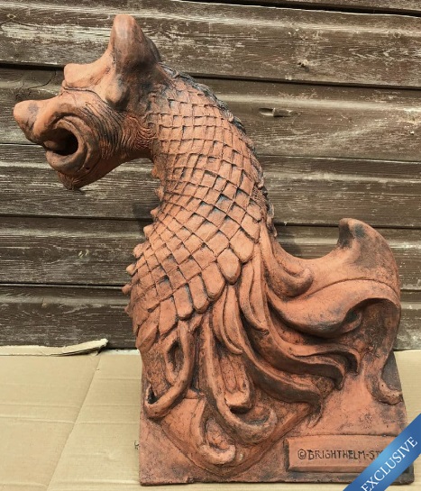 Dieser außergewöhnliche Drache erinnert an mittelalterliche Burghöfe. Seine ausgebreiteten Schwingen haben etwas dramatisch schönes und sein schlanker Körper wirkt elegant und schlangenartig. Er schlinkt sich um den Dachfirst und faucht seinen Feinden entgegen. Seine Figur ist sehr plastisch ausgearbeitet was ihm eine feurige Lebendigkeit verleiht. Drachen dienen als Schutz vor bösen Geistern und liefern ein eindrucksvolles Bild ab. Besonders bei Sonnenuntergang, wenn nur die schwarze Silouette dieses Fabelwesens zu sehen ist kann man sich seinem Bann kaum entziehen.