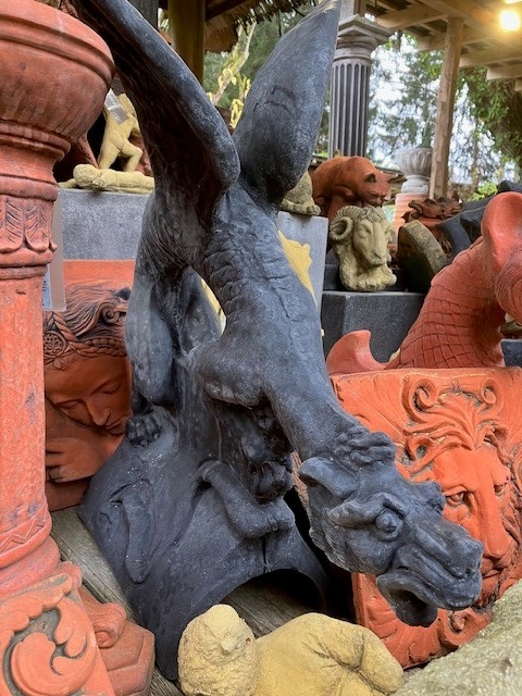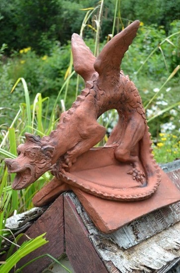 Dieser außergewöhnliche Drache erinnert an mittelalterliche Burghöfe. Seine ausgebreiteten Schwingen haben etwas dramatisch schönes und sein schlanker Körper wirkt elegant und schlangenartig. Er schlinkt sich um den Dachfirst und faucht seinen Feinden entgegen. Seine Figur ist sehr plastisch ausgearbeitet was ihm eine feurige Lebendigkeit verleiht. Drachen dienen als Schutz vor bösen Geistern und liefern ein eindrucksvolles Bild ab. Besonders bei Sonnenuntergang, wenn nur die schwarze Silouette dieses Fabelwesens zu sehen ist kann man sich seinem Bann kaum entziehen.