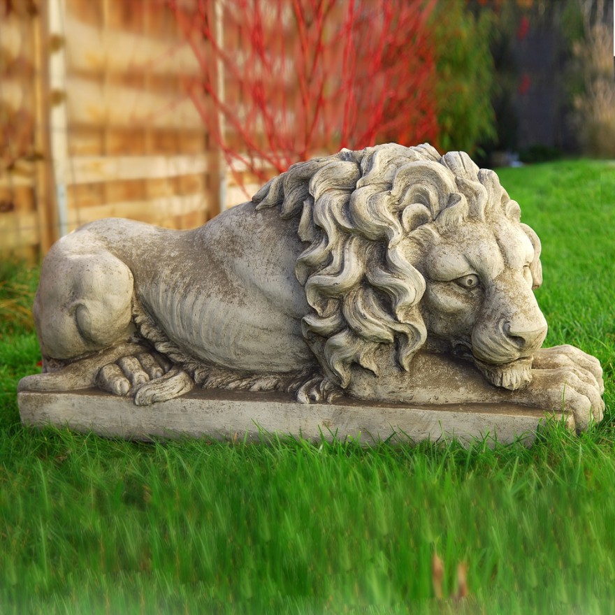 Dieser majestätische Löwe kann als Willkommensfigur für Eingangsbereiche verwendet werden. Aber auch als Steinfigur im Garten kommt er wunderbar zur Geltung. Dabei bietet seine weiße Gestalt einen tollen Kontrast zum Grün der umliegenden Pflanzenwelt. Königlich wellt sich seiner Mähne über sein Haupt und sein Blick ist tief und ernst. Er ist ein eindrucksvoller Bewacher und wirkt wie ein Krafttier, voll Anmut und Stärke.