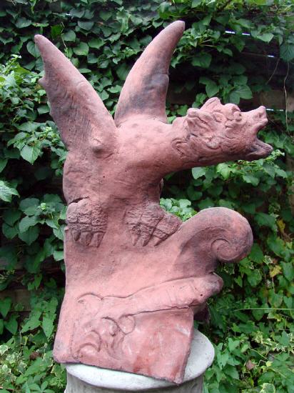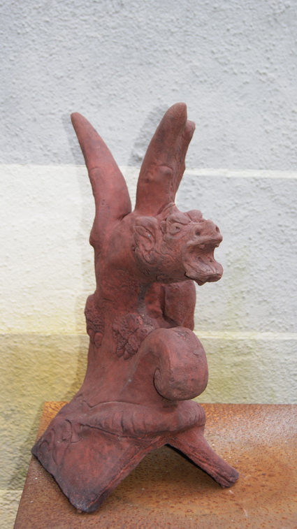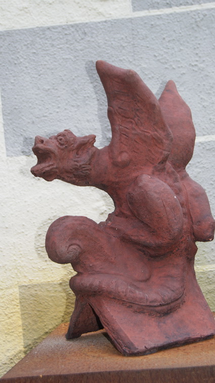 Dieser außergewöhnliche Drache erinnert an mittelalterliche Burghöfe. Seine ausgebreiteten Schwingen haben etwas dramatisch schönes. Er schlinkt sich um den Dachfirst und faucht seinen Feinden entgegen. Seine Figur ist sehr plastisch ausgearbeitet was ihm eine feurige Lebendigkeit verleiht. Drachen dienen als Schutz vor bösen Geistern und liefern ein eindrucksvolles Bild ab. Besonders bei Sonnenuntergang, wenn nur die schwarze Silouette dieses Fabelwesens zu sehen ist kann man sich seinem Bann kaum entziehen.