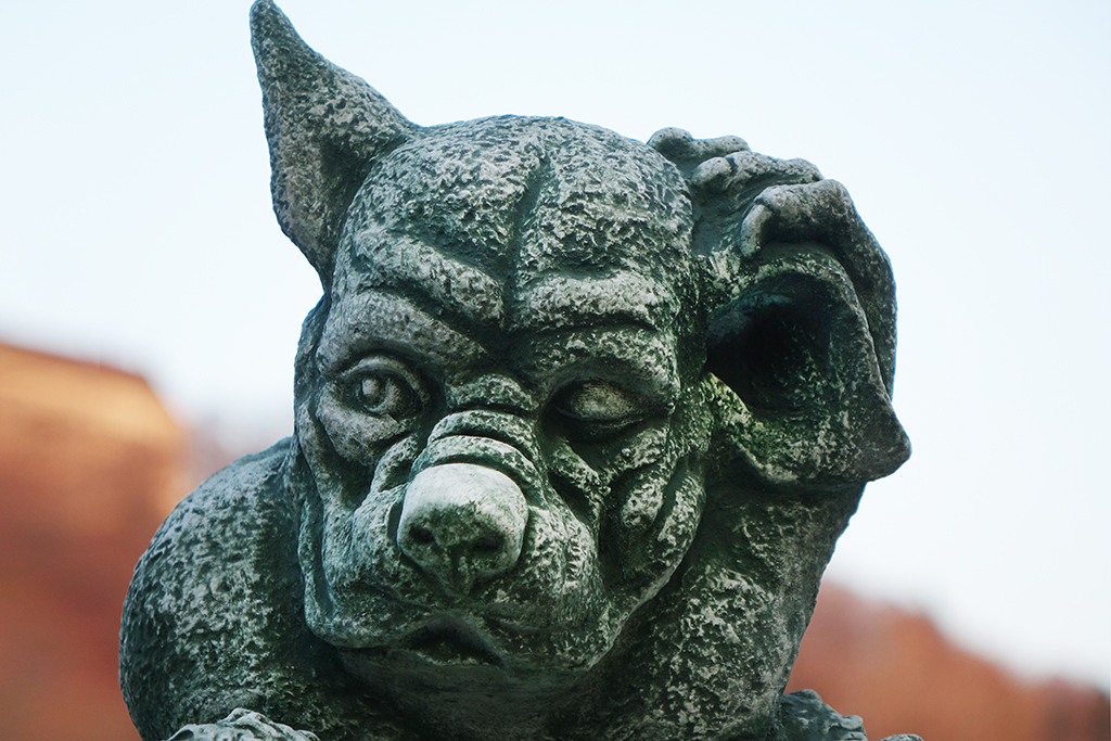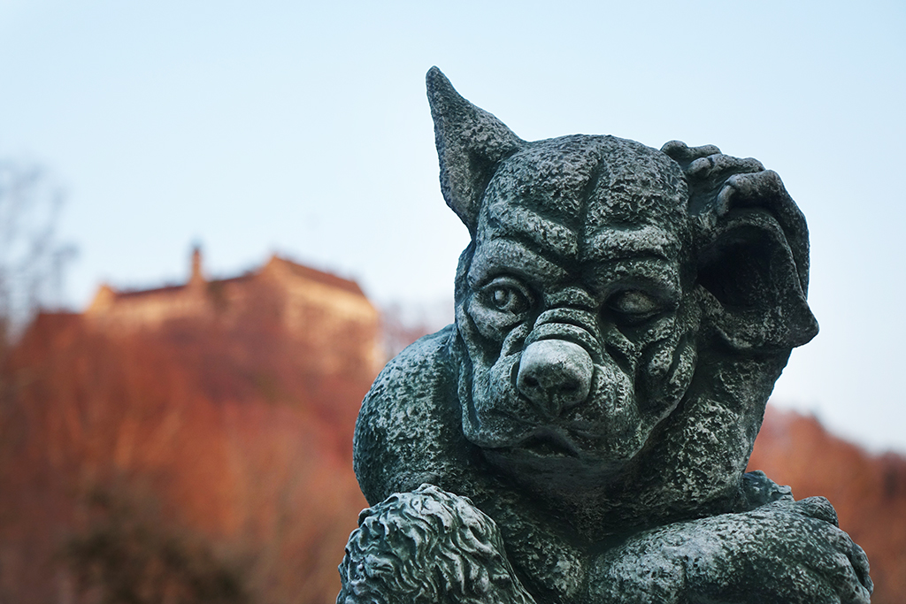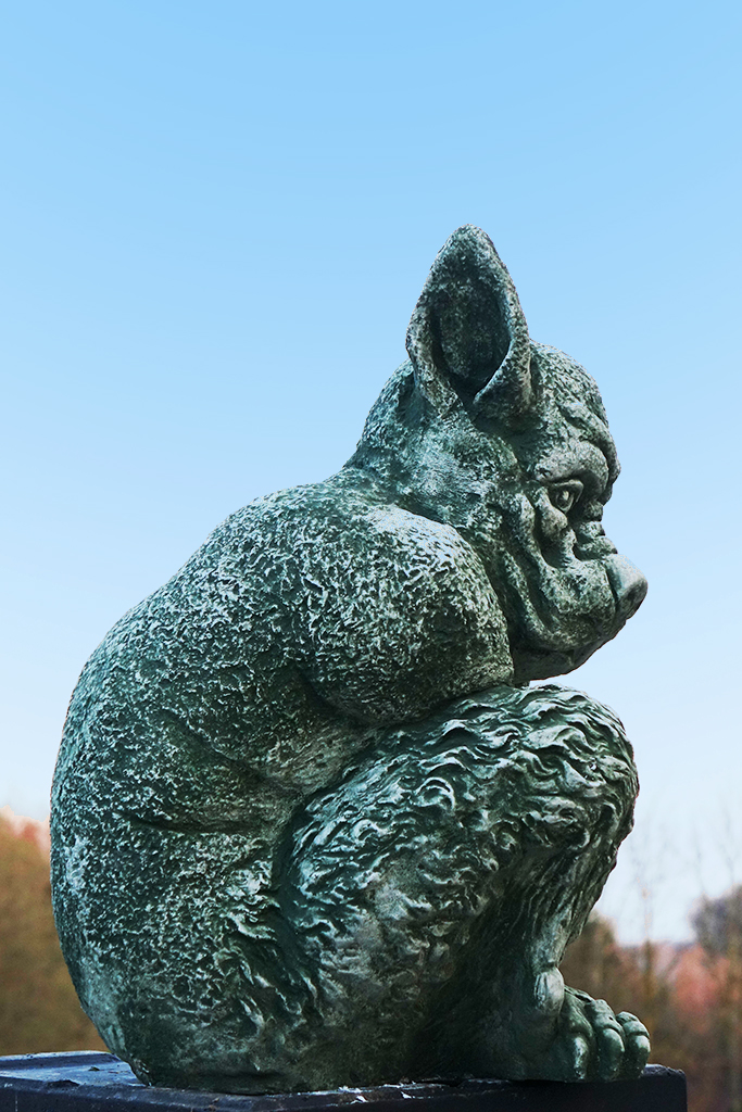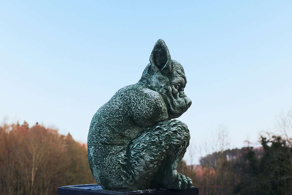 Gargoyles sind Fabelwesen, die bei Tagesanbruch zu Stein erstarren und bei Anbruch der Dunkelheit wieder zum Leben erwachen. Dieser Gargoyle wartet nachdenklich auf die Nacht, damit er in Ihrem Garten wieder sein Unwesen treiben kann. Ein Gargoyle bezeichnet eigentlich einen Wasserspeier, (Französisch: Gargouille) wie er oft an alten Brunnen, Kirchen oder alten Häusern zu finden ist.