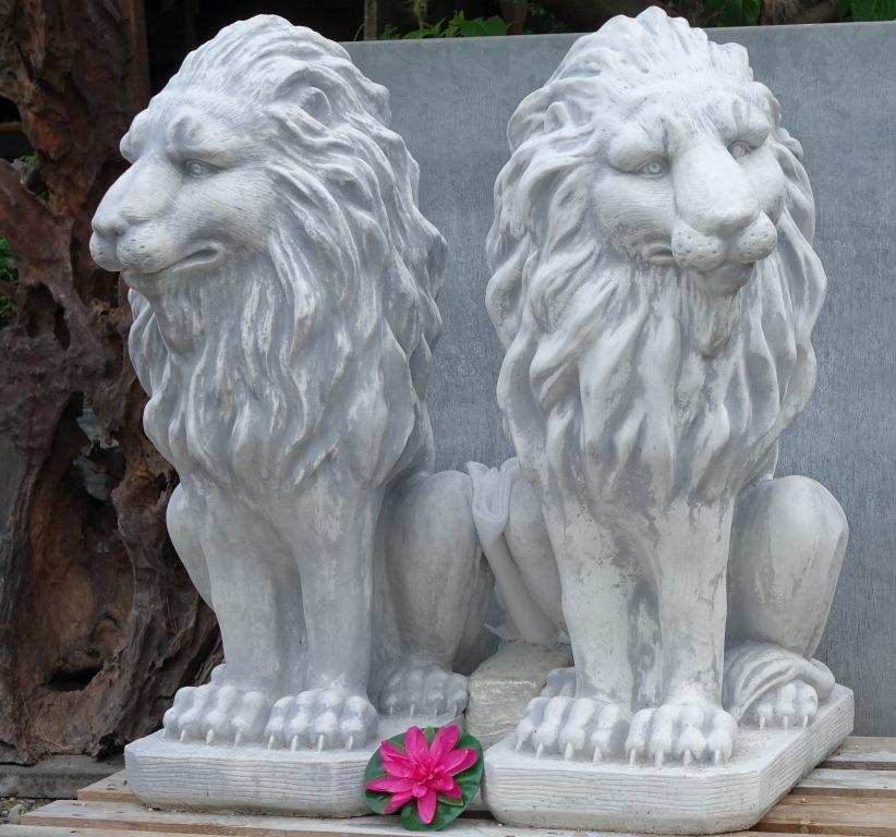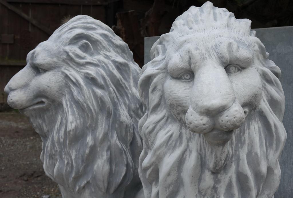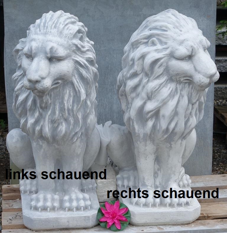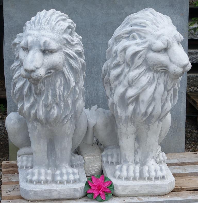Diese majestätischen Löwen könen als Empfangsfiguren für Eingangsbereiche und Hofeinfahrten verwendet werden. Aber auch als Steinfiguren für den Garten kommen sie wunderbar zur Geltung. Dabei bietet ihre weiße Gestalt einen tollen Kontrast zum Grün der umliegenden Pflanzenwelt. Königlich wellen sich ihre Mähne über ihre Haupt und ihr Blick ist tief und ernst. Sie sind eindrucksvolle Bewacher und wirken wie Krafttiere, voller Anmut und Stärke. Der eine leicht nach links und der andere nach rechts. So bilden sie ein imposantes, bewundernswertes Paar.
