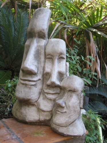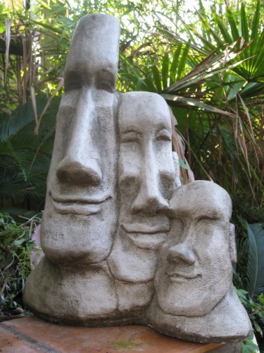 Diese drei Herren orientieren sich am Vorbild der Osterinselköpfe, auch Moais genannt. Dort stehen über 600 dieser kolossalen Steingesichter, teilweise mit Körpern und faszinieren die Menschen noch heute. Sie dienten wahrscheinlich zu rituellen Zwecken. In unserem Trio haben alle drei ein lächeldes Gesicht und die typischen langen Nasen zusammen mit hohen Wangenknochen. Sie schmiegen sich glücklich aneinander und wirken wie ein Symbol für Freundschaft und Zusammenhalt. Ihre positive Energie geben sie an ihr Umfeld weiter und erheitern das gesamte Ambiente.