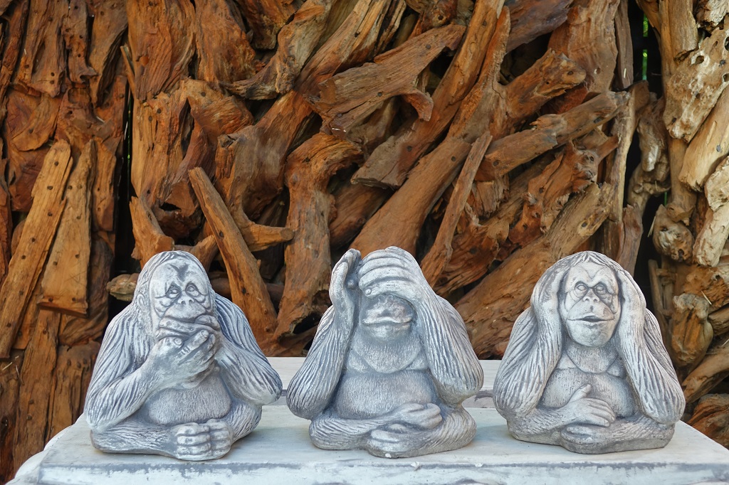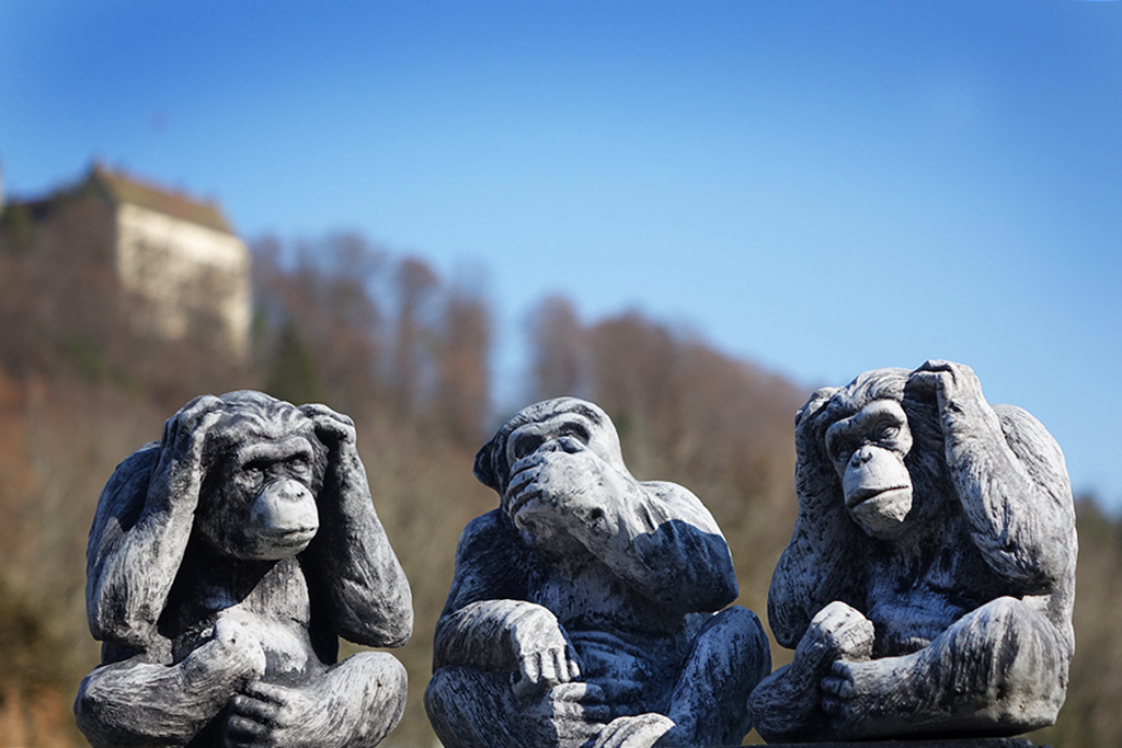 Die Idee der Affen, die nicht sehen, hören und sprechen, kommen ursprünglich aus Japan. Ein berühmtes Drei-Affen-Motiv stammt aus dem 17. Jahrhundert und befindet sich nahe der Stadt Nikko auf der Hauptinsel Honshu in Japan, etwa 140 Kilometer nördlich von Tokio.
