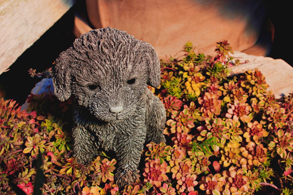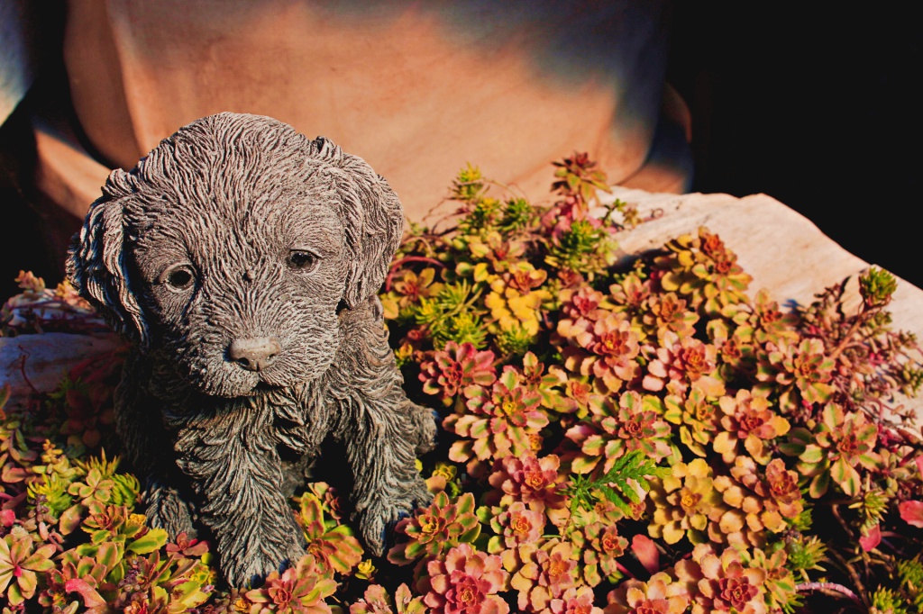 Mit seinem wuscheligen Knuddelfell und der kleinen Stupsnase fällt dieser Welpe sofort ins Auge. Er ist ein Labradoodle, eine Mischung zwischen Labrador und Pudel. Sie sind besonders beliebt für ihr teddyhaftes Aussehen und das flauschige Fell. Aus großen Knopfaugen schaut er den Betrachter an. Seine Größe von 16 Centimetern bietet viele Möglichkeiten bei der Platzwahl. In Kombination mit anderen Tierkindern kann man ein lebendiges Stillleben erzeugen. Steinfiguren in Form von Tieren lassen einen Garten zum Leben erwachen und bieten wundervolle stille Begleiter, die zum Stauen und Träumen einladen.