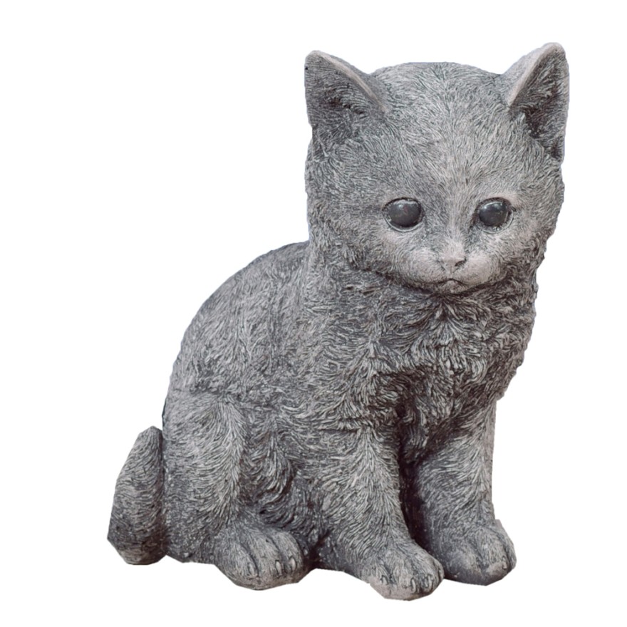 Dieses süße Katzenjunges ist besonders knuffig mit ihren großen Pfoten und den schwarzen, runden Knopfaugen. Ihr Fell ist sehr fein ausgearbeitet und wirkt weich und anschmiegsam, sodass man sie am liebsten streicheln würde. Mit ihrer sitzenden Haltung und gespitzten Ohren schaut sie den Betrachter aufmerksam an. In Kombination mit einer großen Katze oder anderen Tieren kann man ein lebendiges Stillleben erzeugen. Steinfiguren in Form von Tieren lassen einen Garten zum Leben erwachen und bieten wundervolle stille Begleiter, die zum Stauen und Träumen einladen.