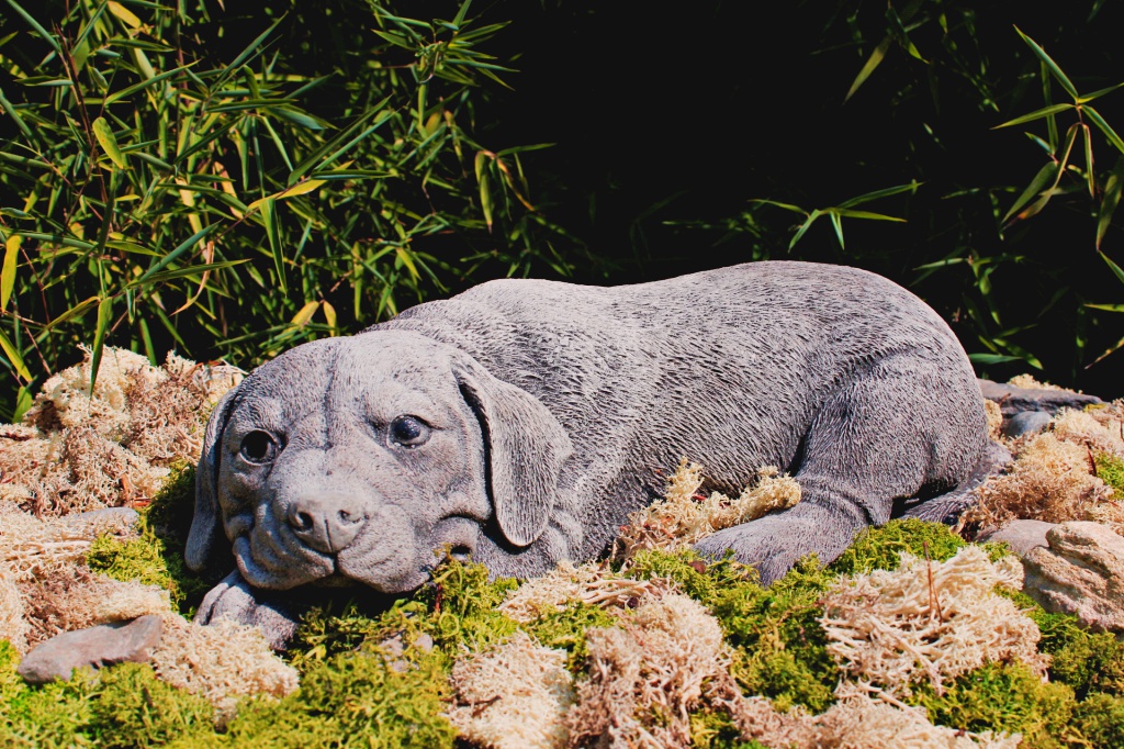 Dieser süße Labrador oder Labradorwelpe ist besonders knuffig mit seinen Schlappohren und den vielen Hautfalten. Sein Fell ist sehr fein ausgearbeitet und wirkt weich und anschmiegsam, sodass man ihn am liebsten streicheln würde. Mit seiner liegenden Haltung könnte man ihn zuerst mit einem Stein verwechseln, doch dann fällt sehr schnell auf, dass es sich hier um einen putzigen Hund handelt. In Kombination mit anderern Welpen oder Hunden kann man ein lebendiges Stillleben erzeugen. Steinfiguren in Form von Tieren lassen einen Garten zum Leben erwachen und bieten wundervolle stille Begleiter, die zum Stauen und Träumen einladen.