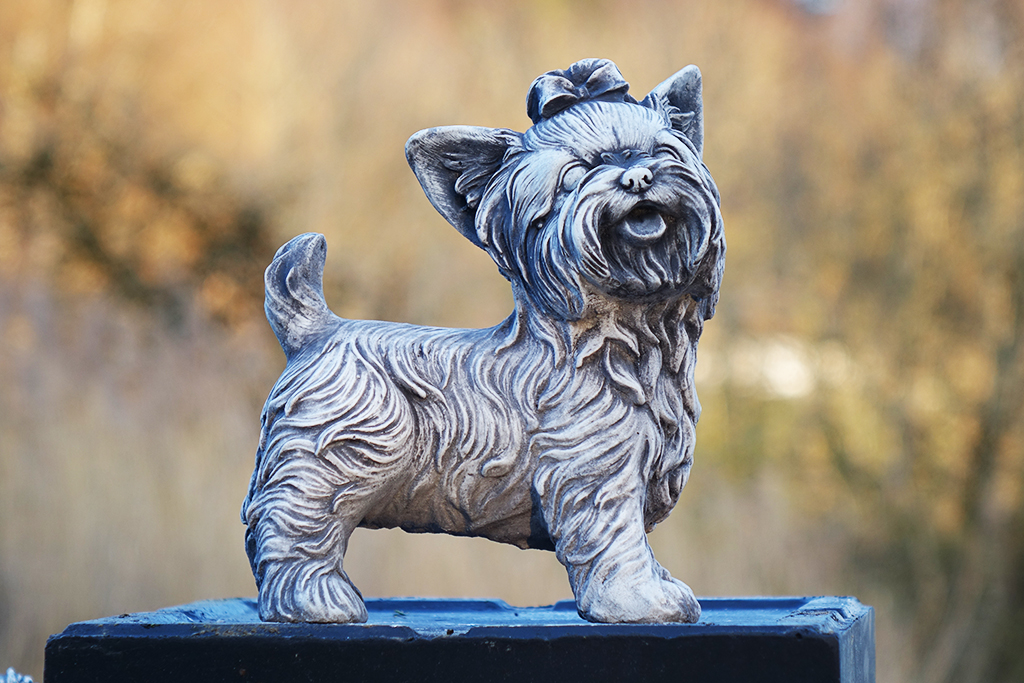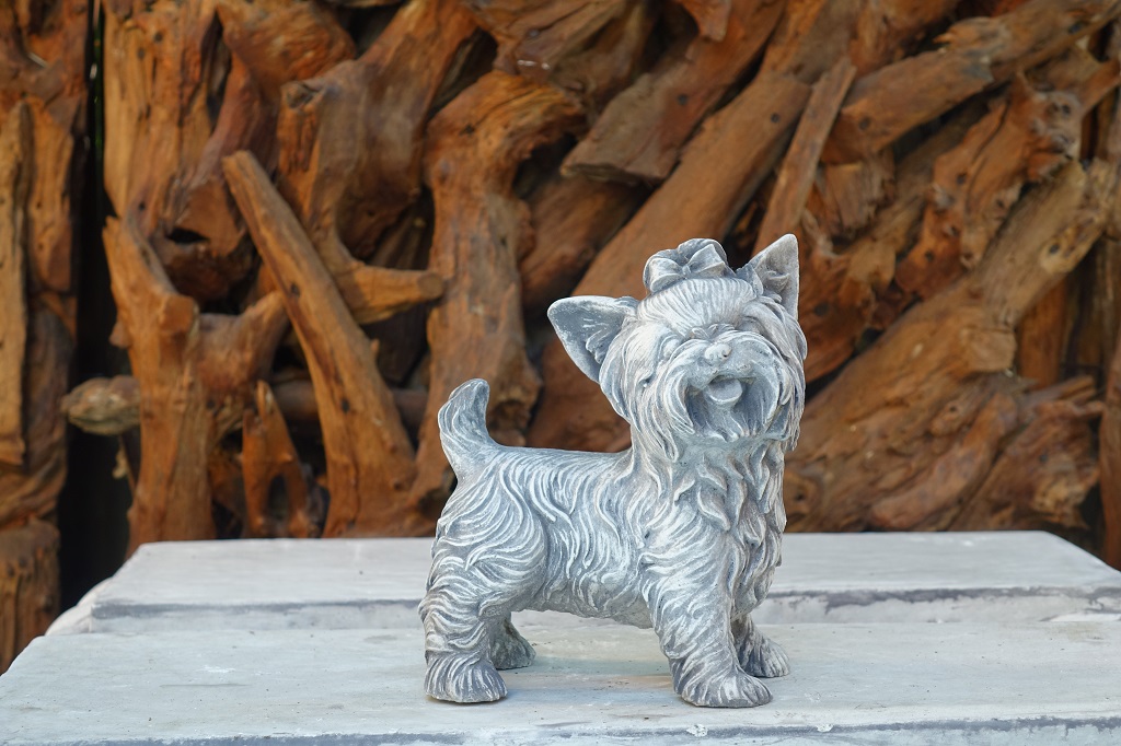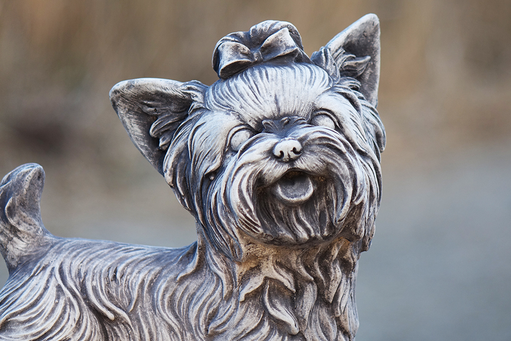 Der sitzende Yorkshire ist aus robustem Steinguß, bringt ca. 4,5 kg Gewicht auf die Waage und ist 26 cm hoch.