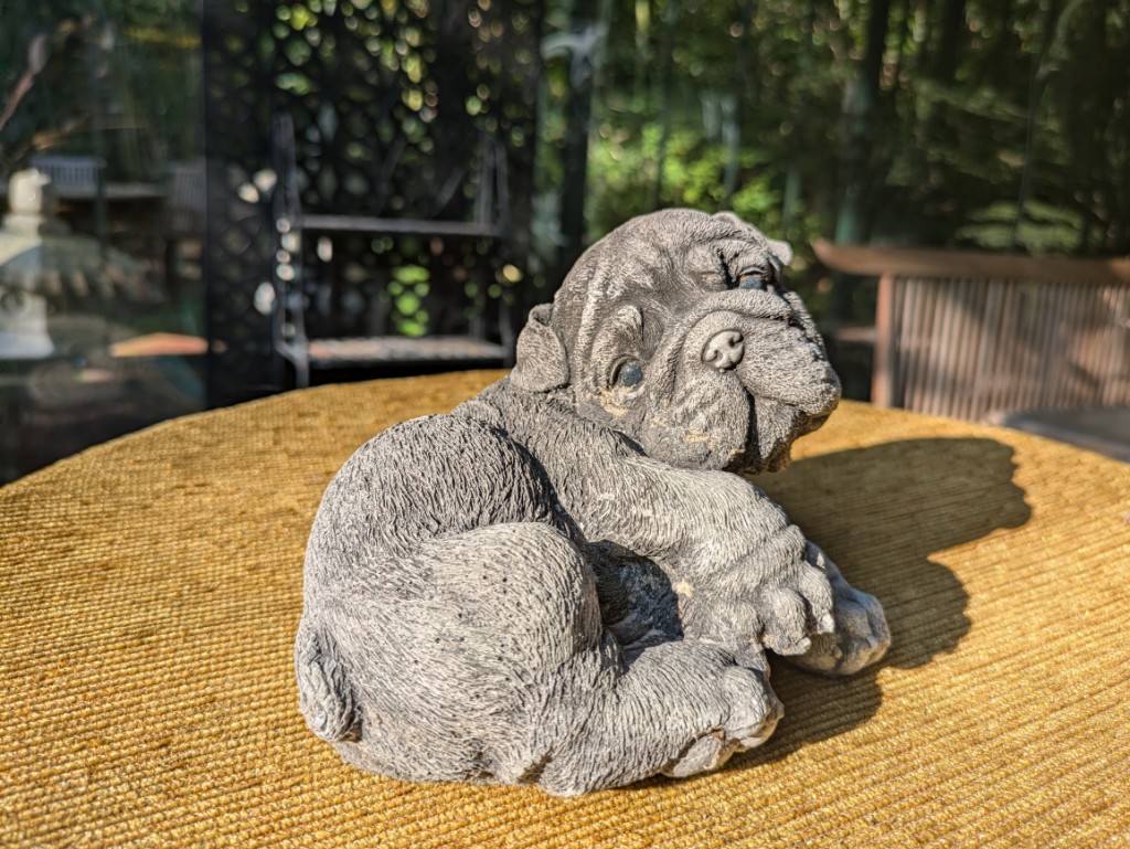 Der sitzende Hund ist aus robustem Steinguß, bringt ca. 6kg Gewicht auf die Waage und ist 24cm hoch.